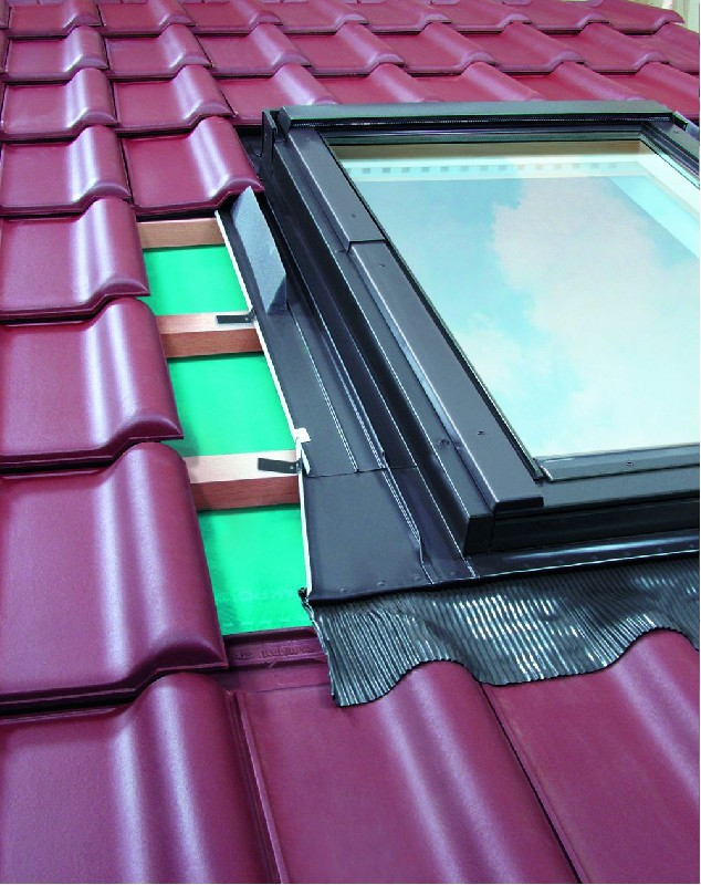 Lemování je doplněno pěnovým těsnícím klínem, odvodňovacím žlábkem a hliníkovou manžetou tvarovatelnou podle typu střešní krytiny.
