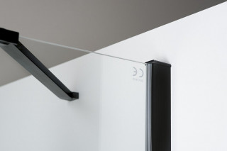 | Speciálně navržené madlo pro pohodlné otevírání dveří. | Ploché magnetické těsnění skryté v hliníkovém profilu v moderním matně černém provedení. | Stěnové nerovnosti skryje hliníkový profil v černé, do kterého lze zasounout sklo dle potřeby až 20 mm. | Otočný profil se zvedací funkcí pro pohodlné otevírání. Čistá linie - sklo protíná profil na obou stranách ve stejné úrovni. Stabilitu skel zajišťuje elegantní vzpěra s nastavitelným úhlem uchycení na obou stranách. |
