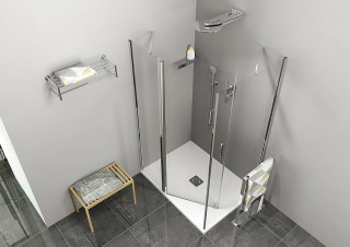 Stěnové nerovnosti elegantně skryje hliníkový profil, do kterého se zasouvá sklo dle potřeby až 20 mm. Stabilitu skel zajišťuje elegantní vzpěra s nastavitelným úhlem uchycení na obou stranách. |