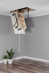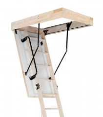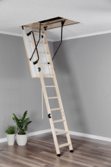 Půdní schody OMAN typu TERMO PS jsou třídílné schody s dřevěným žebříkem, vyrobené z kvalitního borovicového dřeva se zatepleným poklopem z přírodní dřevotřísky polepené oboustranně deskou HDF v bílé barvě, vybavené umělohmotnými ochrannými patkami. Slouží ke vstupu do půdních, případně podkrovních prostor. Poklop je zajištěn speciálním zámkem na klik. Příslušenstvím je dřevěná tyč sloužící pro snadnou manipulaci s poklopem a ovládání zámku. Na stupních jsou vyfrézované drážky proti uklouznutí. Vysunutím stupňů je dosaženo lepšího komfortu výstupu.